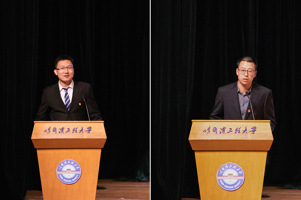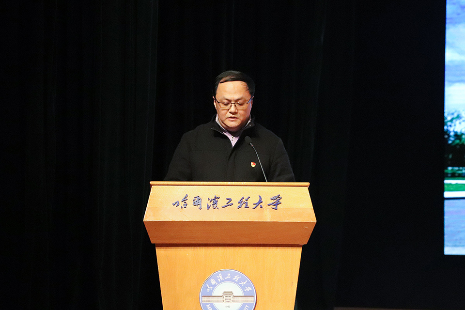 随后,张志俭副校长为学生代表佩戴校徽,哈尔滨工程大学校徽反映了学校的办学特色,美观大方、庄重高雅,更象征着我们一生永不磨灭的军工精神和工程学子身份,每一位同学从戴起校徽那一刻起,便要终身牢记“大工至善、大学至真”的校训,在接下来的人生征途中不忘初心,牢记使命,努力成为又红又专,可靠顶用的社会主义建设者和接班人。