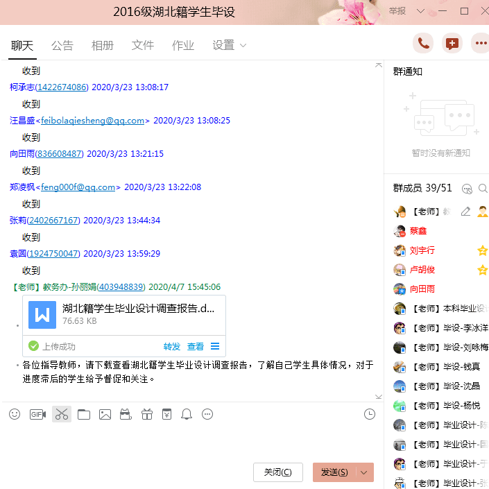 对于湖北籍学生,考虑其心理压力及返校时间的不确定性,学院予以重点关注,单独建立湖北籍学生和指导教师群,学院组织召开视频会议,想学生之所想、急学生之所急,切实解决学生最急迫、最紧要的问题,保证每一位学生顺利完成毕业设计。对湖北籍学生专门设计调查问卷,并形成问卷结果报告,报送指导教师,进行特别关注。