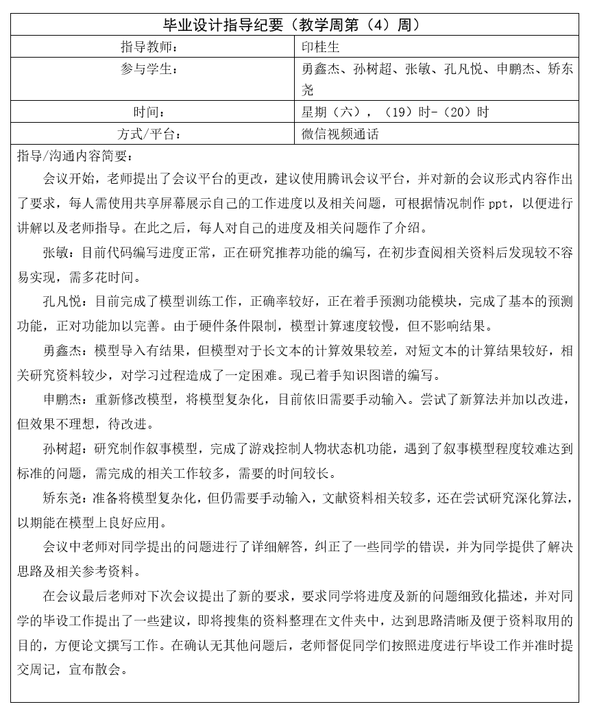 3、要求指导教师与所指导学生建立线上联络(微信群、QQ群等),每周至少进行一次线上见面会,进行进度检查及指导,并上报见面会时间,指导结束后提交会议纪要及指导会议截图;
