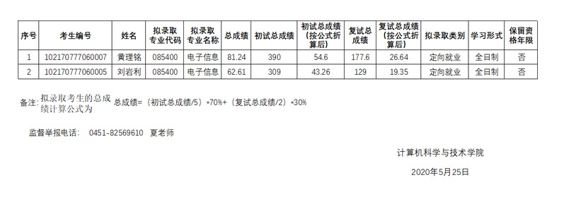 2020年研究生复试学生名单(单考)拟录取名单
