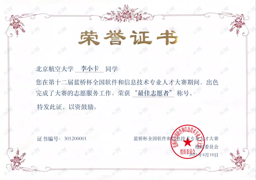 出色完成大赛志愿者服务工作的同学,可获得由大赛组委会颁发的志愿者荣誉证书。