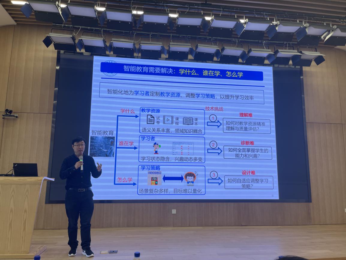 陈恩红教授以“面向智能教育的资源理解、认知诊断和个性化推荐技术与应用”为主题,介绍了大数据驱动的智能教育应用,指出三代教学范式:经验模仿教学范式,计算辅助教学范式,数据驱动教学范式。