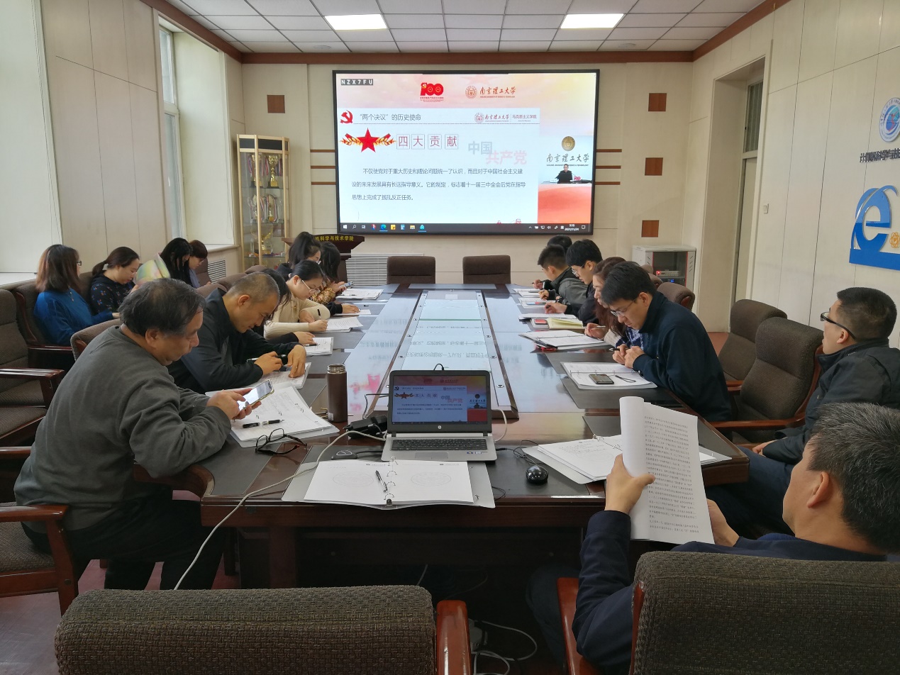 2021年11月24日上午九点,院直机关党支部按照学校《关于组织收听收看第三次专题党课宣讲及近期党史学习教育工作的提示》通知要求,组织全体党员集中收看专题党课宣讲。此次党课以宣传贯彻党的十九届六中全会精神为主要内容。为深入学习贯彻全会精神,学校邀请南京理工大学马克思主义学院院长、博士生导师李俊奎教授,做了题为初心如磐 笃行致远——学习六中全会和《决议》精神的党课宣讲。院直机关党支部全体党员在学院会议室参加了此次集中党课学习。
