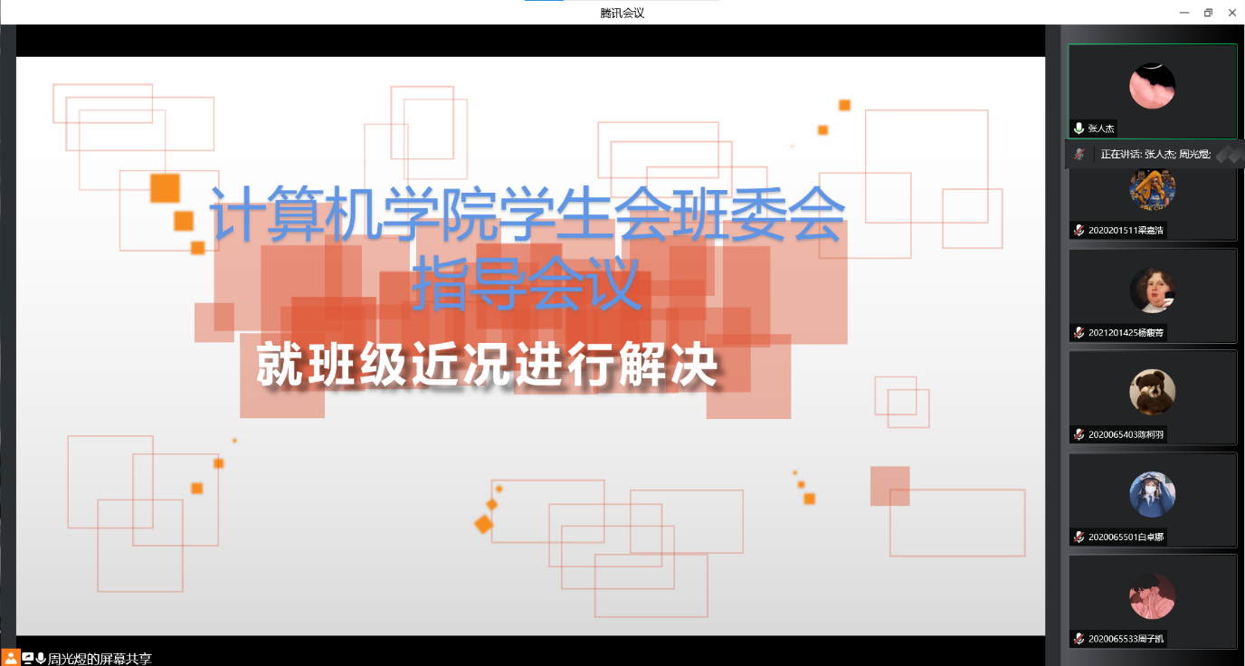 11月10日,澳门电子pg游戏官网学生会于腾讯会议召开了2021秋季学期第三次班委培训会议。本次会议由学生会主持,张人杰主讲,2021级各班班委参加。