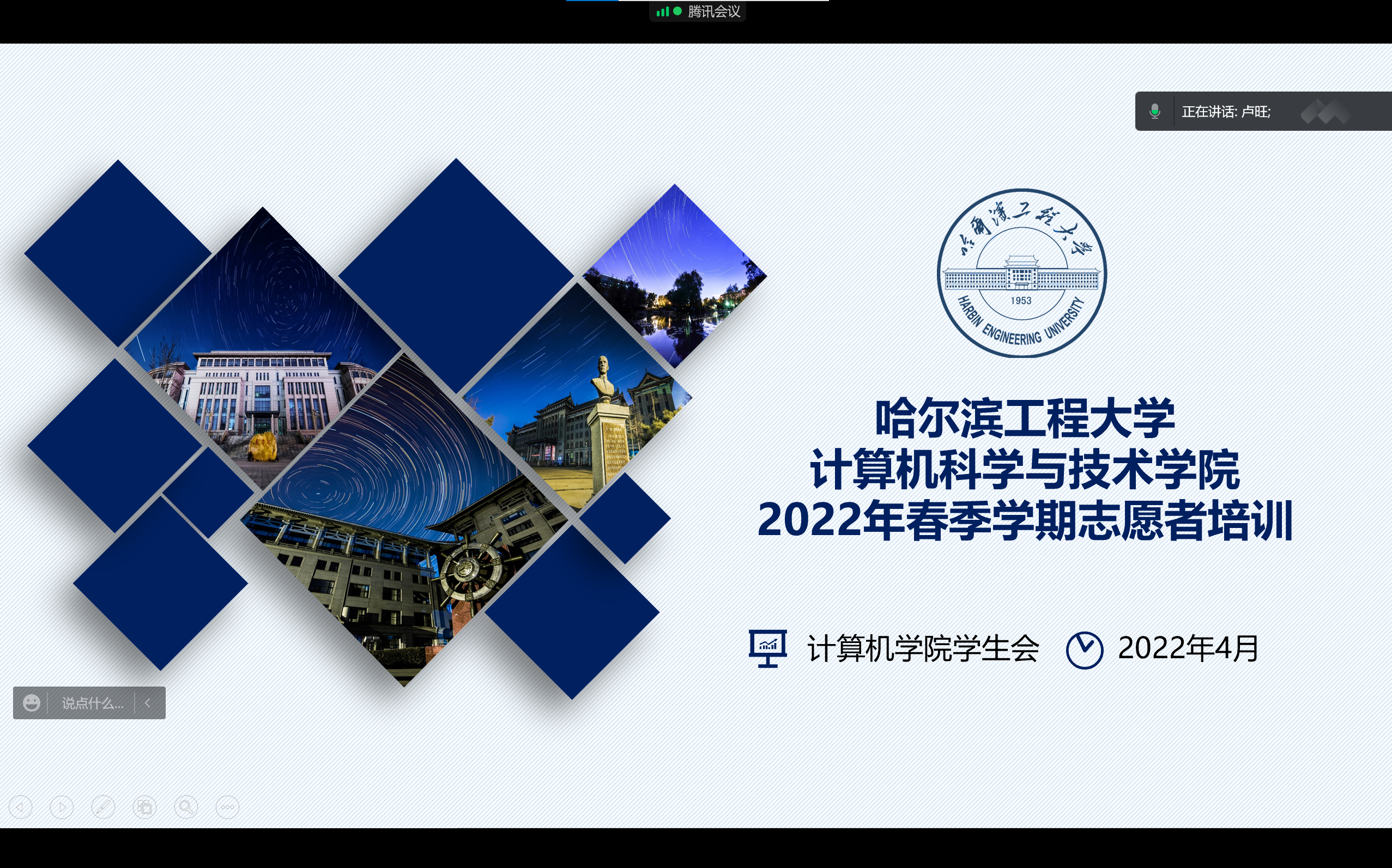 4月1日澳门电子pg游戏官网学生会组织举办了2022年春季学期志愿者培训会议。本次会议由计算机科学与技术学生会主席团成员卢旺主持,学生会全体志愿者参加。本次会议主要讲解学生会4月份要配合学院进行的防疫工作,讲解了对于志愿者不同工作的分工安排。