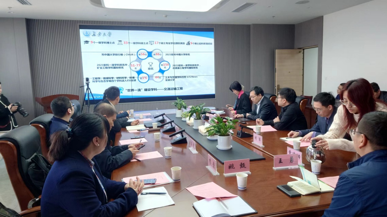 在长安大学,首先参观了车联网与智能汽车实验场,了解了车联网基础设施与车载设备测试等情况。之后,与院长安毅生,副书记陈沛,副院长明洋、王威,学办主任周平以及各系系主任进行了学习交流。就培养方案课程体系改革重点、调动青年教师积极性及有组织的科研工作中存在的问题进行了讨论。安逸生指出两校都是工科院校,发展思路和人才培养目标相近,相互学习、加强合作非常重要,蔡院长此次来访更是为长安大学人才培养提供了新的思路。深化双方在人才培养、师资交流互访、开展招生就业及有组织科研模式建设等领域的交流合作,相信是进一步推动学院高质量发展的基础。同时蔡院长也表示了对于长安大学在学科建设上给予的帮助的感谢,能够不断加强深化合作更加有助于双方学科建设等工作的快速发展,同时也欢迎长安大学安院长一行到哈工程调研访问。