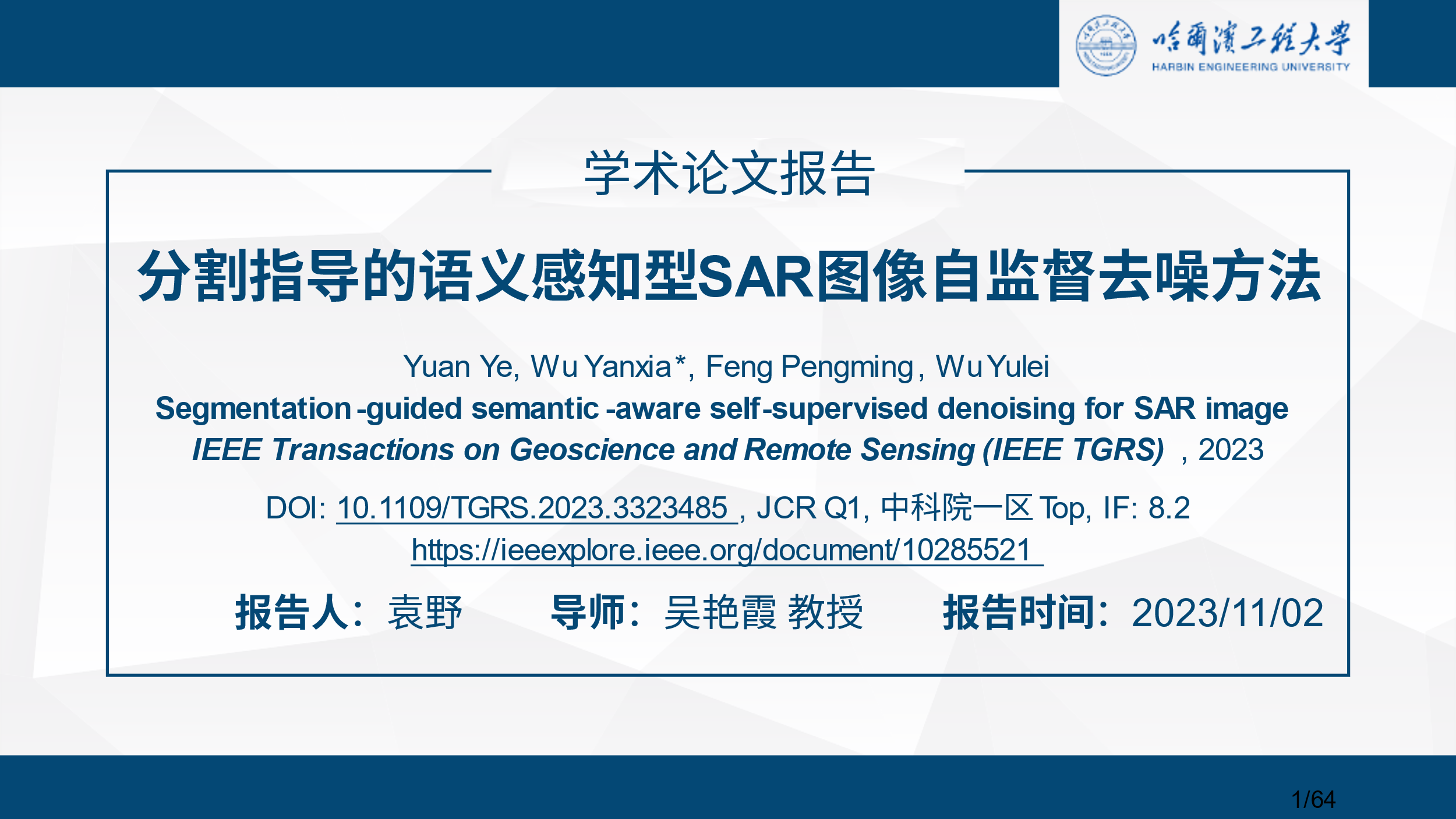 2023年11月2日,澳门电子pg游戏官网在21#4017举办了博士论坛第二期,本次论坛邀请了澳门电子pg游戏官网吴艳霞教授指导的2018级博士研究生袁野,以“分割指导的语义感知型SAR图像自监督去噪方法”为主题进行学术报告,学院多名在校硕士及博士研究生参加了活动。此项研究成果在遥感领域顶级国际期刊IEEE Transactions on Geoscience and Remote Sensing(IEEE TGRS)发表。