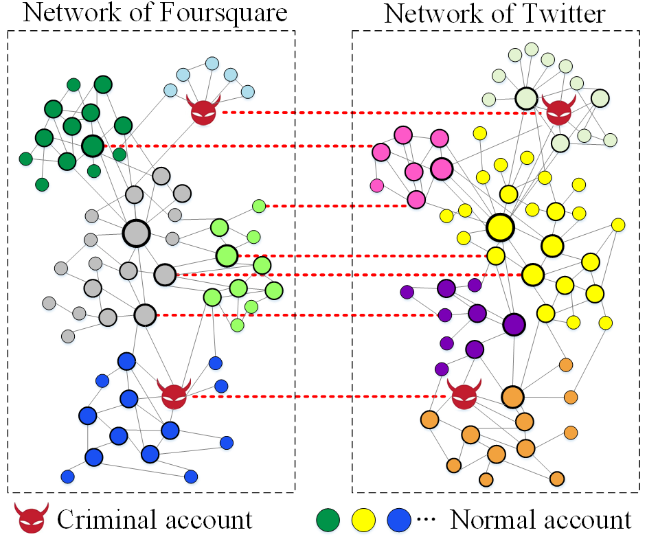 我院发表成果旨在研究针对多社交网络取证场景下的用户去匿名化技术,为跨网络犯罪取证提供了坚实的数据支撑。由于不同的社交网络所提供的服务不同,社交网络的服务语义之间存在明显差异,相同用户在不同的社交网络中的所扮演的角色也随之改变。不同的服务语义特征造成的角色特征淹没,严重制约了跨网络去匿名化的性能。