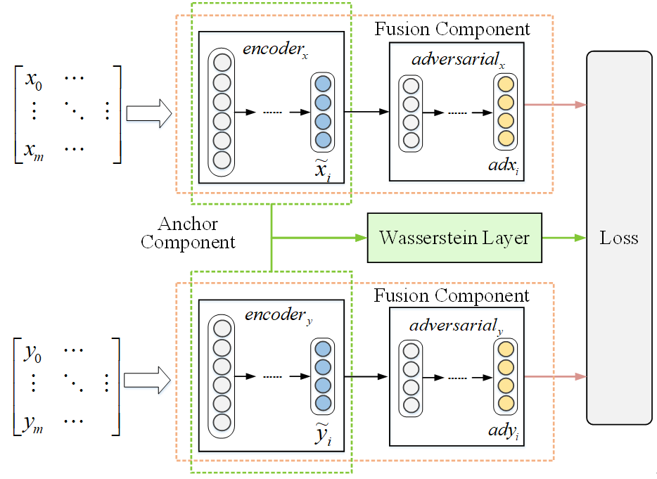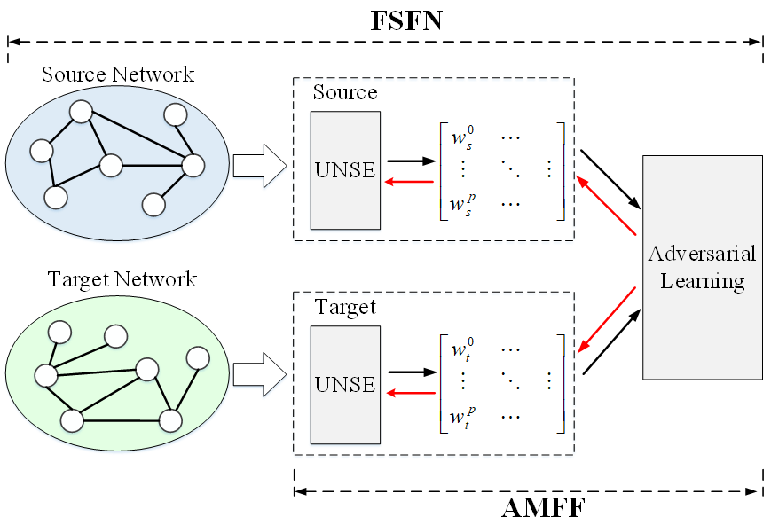 在该篇论文中,作者针对上述问题构建了用户在单一社交网络中的角色特征。为了有效地描述用户角色在不同社交网络之间的转换过程,作者进一步提出基于联合训练的表示学习框架,在联合训练过程中使用概率分布方法衡量用户角色在不同社交网络之间转化的代价,并对用户角色在不同社交网络之间的转换进行描述,模型框架如下图所示。论文实验结果表明,作者所设计的基于用户角色转换的去匿名化方法可以有效地提升用户身份识别性能。在三个真实数据集上,该论文所提出的方法在准确率上比传统方法提升4%到7%。