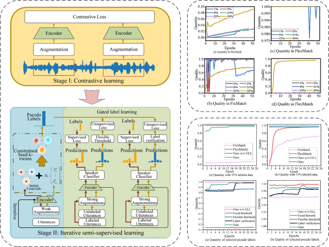 在计算机视觉任务中,半监督学习通过向无标注数据分配伪标签解决了标注的图像数据匮乏的问题。然而,由于话语数据类别远超图像、伪标签的数量和质量难以平衡,导致最先进的半监督学习方法仍难以应用于说话人识别任务。因此,该论文提出了一种创新的双阶段半监督说话人识别方法,在第一阶段构建对比学习网络以获得话语数据的向量映射表示,在第二阶段构建基于聚类和门限标签学习的半监督学习网络,以分配和选择可靠的伪标签数据。