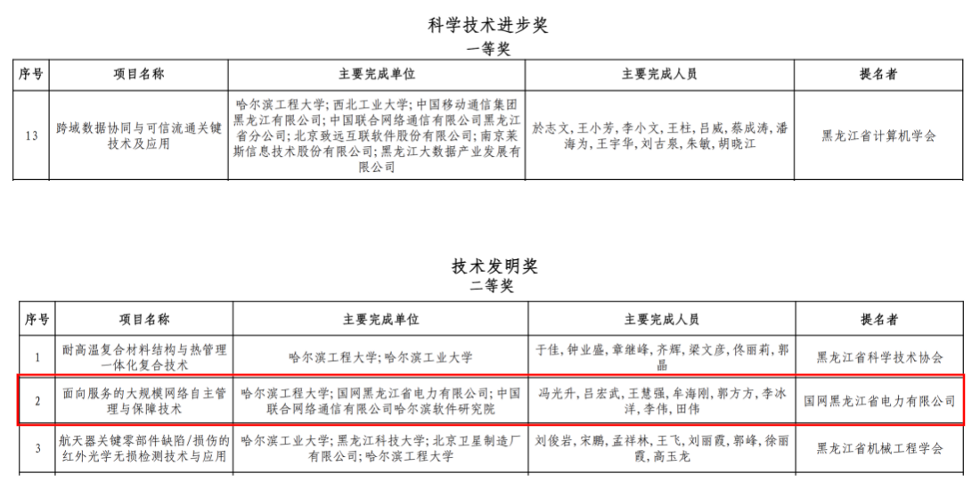 矢志耕耘,喜撷硕果!8月30日,黑龙江省科技厅发布了《关于2023年度黑龙江省科学技术奖获奖名单的公告》,学院荣获黑龙江省科学技术奖2项。其中,於志文教授主持完成的“跨域数据协同与可信流通关键技术及应用”项目荣获科学技术进步奖一等奖,是我校唯一获评的科学技术进步一等奖。冯光升教授主持完成的“面向服务的大规模网络自主管理与保障技术”项目荣获技术发明奖二等奖。