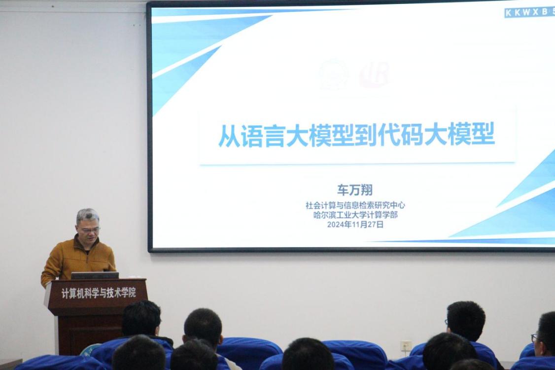 11月27日,澳门电子pg游戏官网在21B4127会议室成功举办了研究生学术年会系列活动之一的专家讲座。本次讲座聚焦人工智能领域的最新前沿——“从语言大模型到代码大模型”,由哈尔滨工业大学计算学部长聘教授、博士生导师车万翔主讲。此次讲座旨在提升研究生的学术素养和创新能力,促进其实践与研究能力的双重提升。