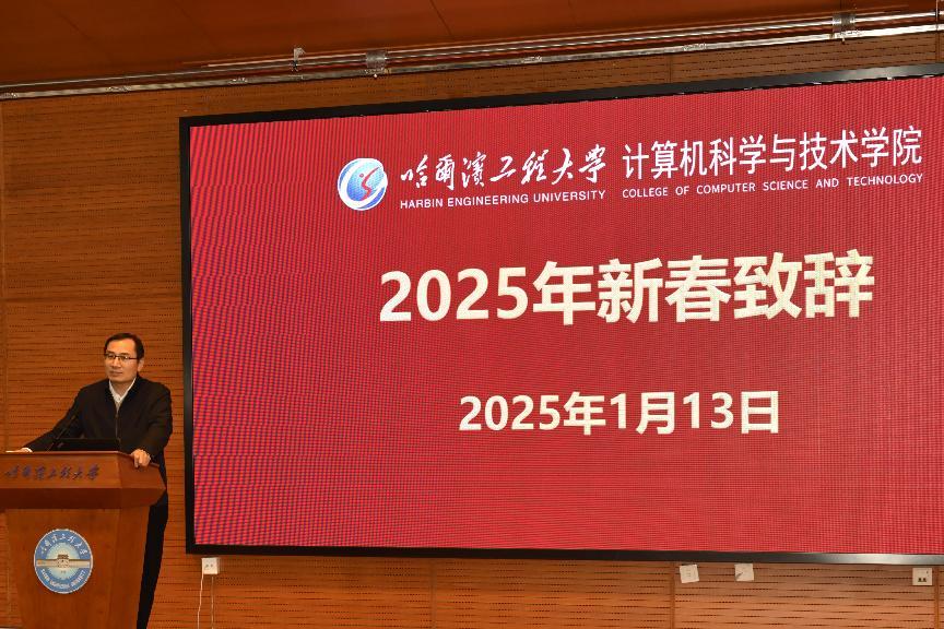 会议最后,於志文副校长进行新春致辞。在新春致辞中於志文副校长对学院2024年在学科建设、人才培养、科学研究、师资队伍、国际合作等方面取得的成效表示充分肯定,向获得表彰的先进典型表示热烈的祝贺,并从学科牵引、人才支撑、国际合作等方面对学院2025年度工作提出了明确的任务目标及要求。他强调,成绩源于奋斗,力量源于团结。希望全体教师要紧跟学校要求,加强团队协作,凝聚奋进动力,贡献智慧力量,为助力学校高质量发展奋力书写计算机学院的高分答卷。