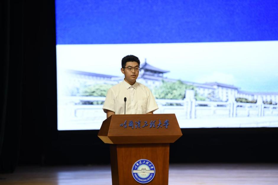 2025级学院首届泛在智能计算兴海领军班新生刘子熙作为新生代表发言。他深情表达了对哈军工精神的敬仰,他表示会把军训锤炼的坚韧,化作攻克技术难关的勇气,传承哈军工的红色基因,不负韶华、不负嘱托,努力成长为“可靠顶用”的计算机人才。