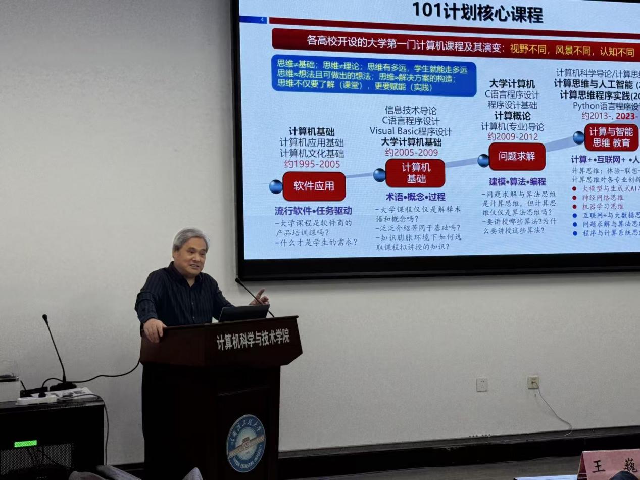 以大学第一门计算机类课程建设为例》为题,介绍了他负责建设的《计算概论(计算机科学导论)》课程,即大学第一门计算机类核心课程取得的相关工作成果,主要内容包括101计划核心课程建设思路与成果,知识图谱、AI助教与数智课程iMOOC