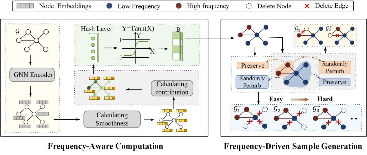《From Semantics to Spectrum: A New Lens on Graph Augmentation Strategy》由郑香平、郝秀鑫、吴博、李伟、任斌、唐滨、郭玉慧、梁循、於志文合作完成。针对现有图增强技术语义失真问题,论文提出低频信号为语义信息稳健载体的核心观点,构建频率感知图对比学习(FA-GCL)框架,通过频域分解指导图增强,并设计动态难度调整(DDA)模块生成递增难度负样本。该框架在多个真实场景基准测试中持续超越现有先进基线模型,具有统计学显著性提升。